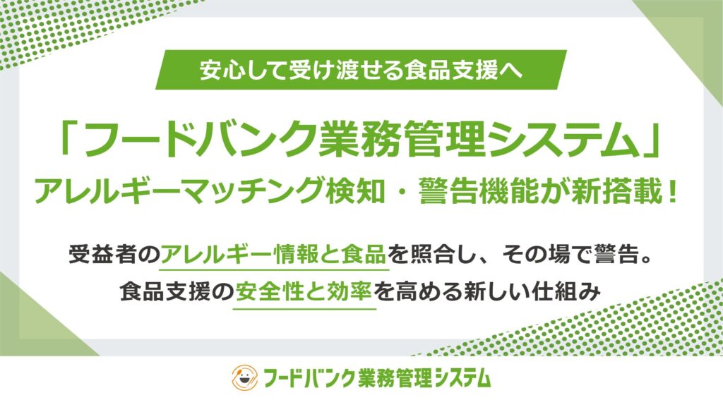 安心して受け渡せる食品支援へ「フードバンク業務管理システム」に、「アレルギーマッチング検知・警告機能」が新たに搭載!ピッキング時に受益者と食品のアレルギー情報を照合し、その場で警告表示。食品支援の”安全性・効率を高める”新たな仕組み。